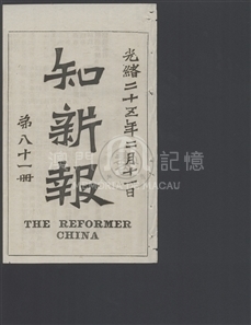 《知新報》第八十一期刊登《鄂撫曾和奏請酌量變通成例摺》、《法人謀取馬吉士埠》、《法國快炮新式》、《種煙宜用華人》等文章。《知新報》於1897年2月22日(清光緒二十三年正月二十一日)創刊,由康有為籌劃出版、梁啟超兼理筆政、何廷光(字穗田)出資、康廣仁則負責具體運作創辦,該報於維新運動時期所創辦,為維新派在華南地區的重要刊物。1898年(清光緒二十四年)的百日維新失敗後,《知新報》仍繼續出版。1899年7月20日,康有為在加拿大創立保救大清皇帝會後,更將《知新報》與《清議報》定為會報。《知新報》原按上海《時務報》模式創辦,初擬為《廣時務報》。及後經梁啟超斟酌後,才定名《知新報》,報頭使用篆書。其辦報宗旨,正如其創刊文章的「知新報緣起」指出:「不慧於目,不聰於耳,不敏於口,曰盲、聾、啞,是謂三病」而「報者,天下之樞鈴,萬民之喉舌也,得之則通,通之則明,明之則勇,勇之則強,強則政舉而國立,敬修而民智。」《知新報》是澳門第二份中文報紙,翻譯不少西文報刊,錄英、俄、德、法、美、日等各國大事,同時遠銷海外舊金山、悉尼、安南、新加坡等地。設社址於澳門南灣大井頭四號,其後在1900年11月22日(清光緒二十六年十月初一)出版的第129期有遷館告白:從大井頭四號移寓至門牌十九號。初為5日刊,自1897年5月31日(清光緒二十三年五月初一)的出版的第20冊起,改為旬刊 (十日刊),篇幅較前增加一倍;又至1900年2月14日(清光緒二十六年正月十五日)出版的第112冊開始,再改為半月刊,每期約60餘頁,冊裝。目前所收集的最後一期是1901年2月3日(清光緒二十六年十二月十五日)出版的第134冊,是否仍有後續出版的刊冊,有待進一步研究。本會感謝中山大學圖書館的支持,合作將該館珍藏的共134冊《知新報》原件進行電子化,得以在此平台與公眾分享。此外,本會為每期之目錄加設鏈結功能,以便各方讀者閱讀。《知新報》主要撰述和譯者如下:撰述:何樹齡、韓文舉、梁啟超、徐勤、劉楨麟、王覺任、陳繼儼、歐榘甲、康廣仁、黎祖健、麥孟華、林旭、孔昭炎、康有為 英譯:周靈生、盧其昌、陳焯如、甘若雲葡譯:宋次生德譯:沙士日譯:唐振超、山本正義、康同薇