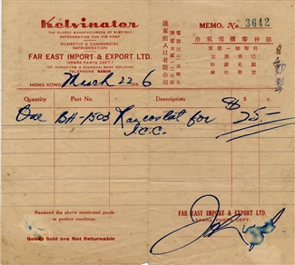 1956年3月22日,禮記雪糕向位於香港的遠東出入口有限公司購入Kelvinator牌雪櫃部件自動掣之單據,立於1956年3月22日,編號3642。單據上顯示Kelvinator為最歷史悠久的家用雪櫃製造商。