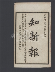 《知新报》第三期刊登《地球大势公论总序一》、《养民要折》、《辟雍盛事》、《知新报缘起》等文章。《知新报》于1897年2月22日(清光绪二十三年正月二十一日)创刊,由康有为筹划出版、梁启超兼理笔政、何廷光(字穗田)出资、康广仁则负责具体运作创办,该报于维新运动时期所创办,为维新派在华南地区的重要刊物。1898年(清光绪二十四年)的百日维新失败后,《知新报》仍继续出版。1899年7月20日,康有为在加拿大创立保救大清皇帝会后,更将《知新报》与《清议报》定为会报。《知新报》原按上海《时务报》模式创办,初拟为《广时务报》。及后经梁启超斟酌后,才定名《知新报》,报头使用篆书。其办报宗旨,正如其创刊文章的「知新报缘起」指出:「不慧于目,不聪于耳,不敏于口,曰盲、聋、哑,是谓三病」而「报者,天下之枢铃,万民之喉舌也,得之则通,通之则明,明之则勇,勇之则强,强则政举而国立,敬修而民智。」《知新报》是澳门第二份中文报纸,翻译不少西文报刊,录英、俄、德、法、美、日等各国大事,同时远销海外旧金山、悉尼、安南、新加坡等地。设社址于澳门南湾大井头四号,其后在1900年11月22日(清光绪二十六年十月初一)出版的第129期有迁馆告白:从大井头四号移寓至门牌十九号。初为5日刊,自1897年5月31日(清光绪二十三年五月初一)的出版的第20册起,改为旬刊 (十日刊),篇幅较前增加一倍;又至1900年2月14日(清光绪二十六年正月十五日)出版的第112册开始,再改为半月刊,每期约60余页,册装。目前所收集的最后一期是1901年2月3日(清光绪二十六年十二月十五日)出版的第134册,是否仍有后续出版的刊册,有待进一步研究。本会感谢中山大学图书馆的支持,合作将该馆珍藏的共134册《知新报》原件进行电子化,得以在此平台与公众分享。此外,本会为每期之目录加设链结功能,以便各方读者阅读。《知新报》主要撰述和译者如下:撰述:何树龄、韩文举、梁启超、徐勤、刘桢麟、王觉任、陈继俨、欧榘甲、康广仁、黎祖健、麦孟华、林旭、孔昭炎、康有为 英译:周灵生、卢其昌、陈焯如、甘若云葡译:宋次生德译:沙士日译:唐振超、山本正义、康同薇