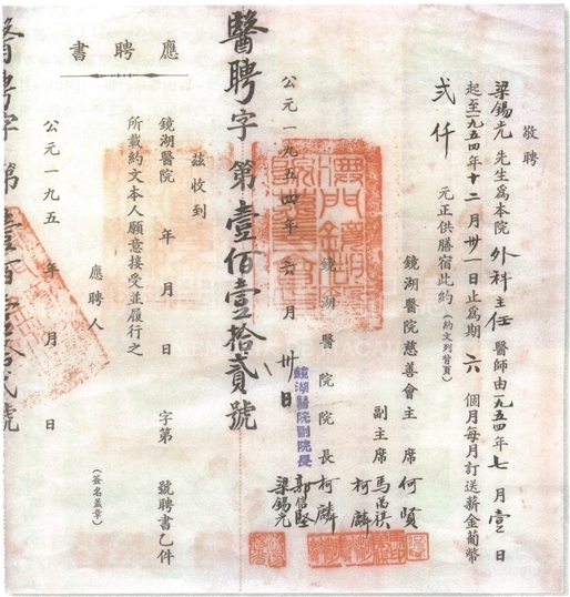 1946年7月1日,镜湖慈善会聘请广州博济医院院长兼外科主任梁锡光医生来镜湖医院任外科主任。1952年起兼任镜湖医院副院长。