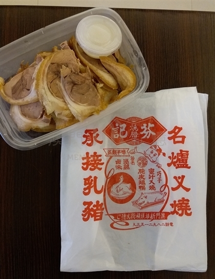 從芬記燒臘外賣的燻蹄,配上酸汁。以前是用發泡膠盒,在發泡膠禁止進口後,採用膠盒。