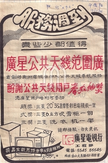 广星公共天线范围广,首创将广州电视台加入公共天线系统服务,酬谢公共天线用户举办抽奖,凭广星用户咭均可参加。