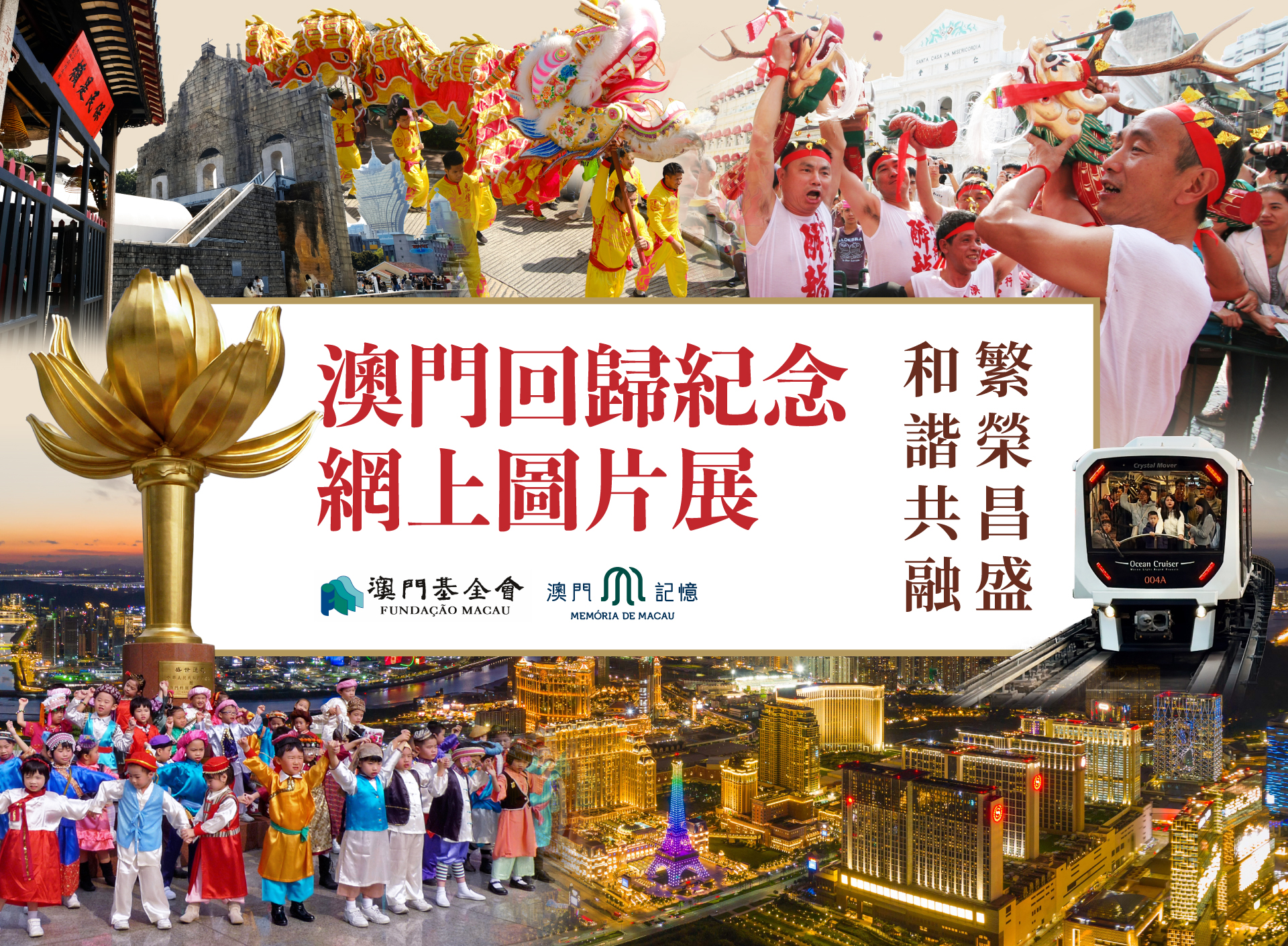 “澳門記憶”文史網整合精華,推出“繁榮昌盛 和諧共融——澳門回歸紀念網上圖片展”,在原圖片展基礎上增入徵集佳作。展覽分為九大板塊,系統梳理特區成立以來,城市建設、制度發展、人文傳承等方面的深刻變遷,全景呈現澳門二十六載的發展軌跡與豐碩成果。