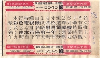 宣傳黑白及彩色電視公共天線廣告,範圍廣,服務佳。廣告文案:閣下想選購或修理…… 冷氣機、電視機、雪櫃、洗衣機、汽車冷氣機、公共天線,廣星會為你解決一切問題,請即電:5545。廣星公共天線範圍廣、服務佳。本行特備由14寸至26寸各名廠彩色電視機供各位選擇另備有20寸及24寸名廠黑白電視機特價推銷(由本行保用一年)營業時間上午九時至下午九時卅分歡迎參觀。