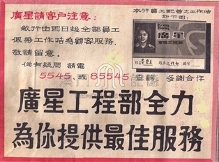廣告文案:廣星請客戶注意:敝行由即日起全部員工佩帶工作咭為顧客服務,敬請留意。倘有疑問,請電5545或85545查詢,多謝合作。廣星工程部全力為你提供最佳服務。