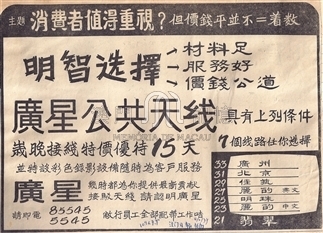 廣告文案:主題:消費者值得重視?但價錢平並不 = 着數。明智選擇:材料足、服務好、價錢公道。廣星公共天線具有上列條件。歲晚接線特價優待15天,並特設彩色錄影設備隨時為客戶服務;7個線路任你選擇:33-廣州;31-北京;29-佳藝;27-麗的(英文);25-明珠;23-麗的(中文);21-翡翠。廣星幾時都為你提供最新貢獻。接駁天線,請認明廣星。請即電85545、5545。敝行員工全部配帶工作咭。