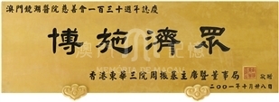 香港東華三院與鏡湖醫院同是民間慈善組織醫院,兩院成立時間相若,且只一水之隔,交往甚篤。鏡湖醫院六十周年慶典時,曾送鏡海慈航牌匾慶賀。鏡湖醫院一百三十周年慶典再送博施濟眾牌匾慶賀。