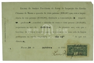 華視學會發予粵華中學120元,其中100元為葡語教員薪金,20元為辦學經費補貼。此收據為葡中雙頁印製。