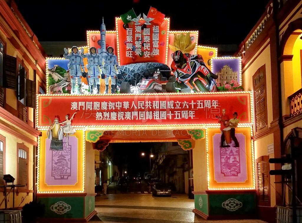 2014年澳門的國慶牌樓是為慶祝中華人民共和國成立65週年及澳門回歸15週年而搭建的,通常建在議事廳前地或塔石廣場附近,展現了傳統的慶典風格,並有相關的圖片展和回顧活動,見證了澳門的歷史與發展。