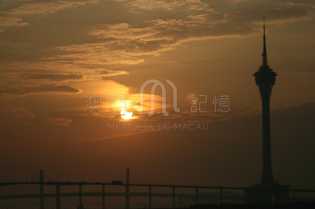 繼2009年7月我國出現日全食後,2010年1月15日出現本世紀最長日環食(達11分鐘),但澳門受地理因素影響,只能看見日偏食。食甚過後,月面漸漸離太陽而去,時間亦將近日落,但日食過程尚未完結,我們叫這做「帶食落」(意即帶著日食落山)。圖中右邊的塔為澳門地標 -- 澳門旅遊塔(Macau Tower),旅遊塔不但是澳門的標誌及旅遊熱點,而且更可遠眺珠江三角洲及部份香港離島的景觀。圖中兩道大橋,近的為澳門西灣大橋,遠的為珠海橫琴大橋。