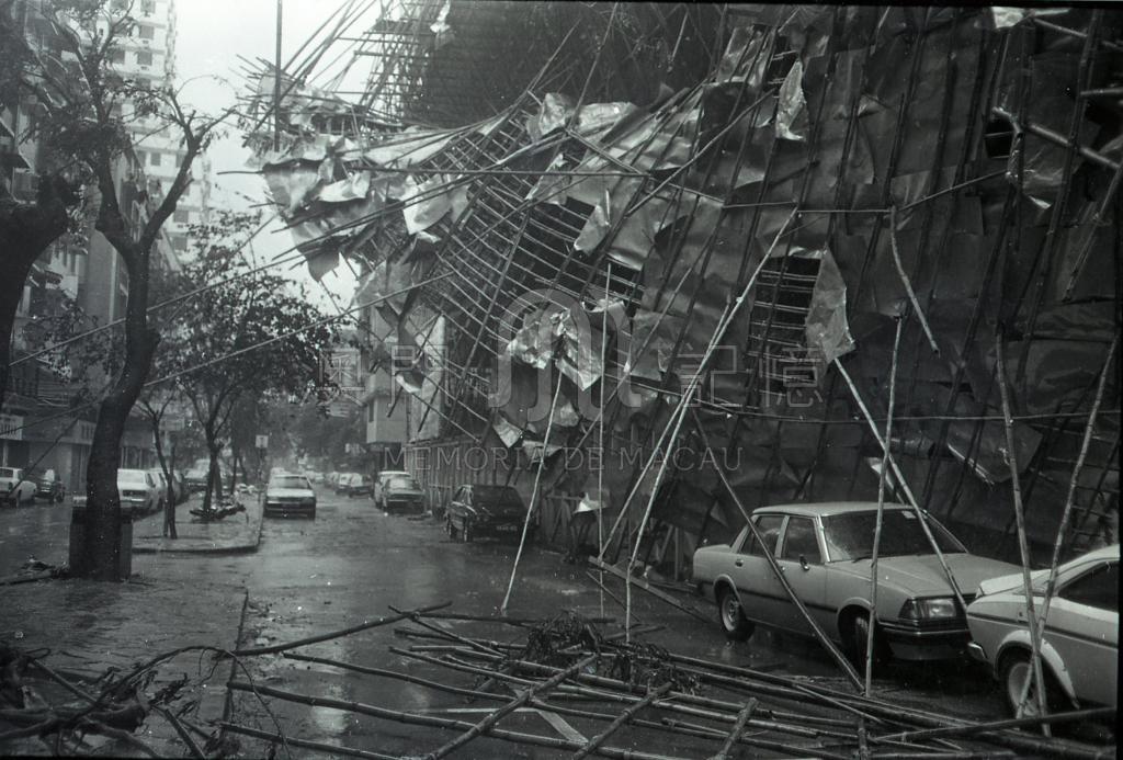 九十年代,颱風吹襲澳門街,大廈棚架倒冧,壓毀車輛,市面水靜河飛。