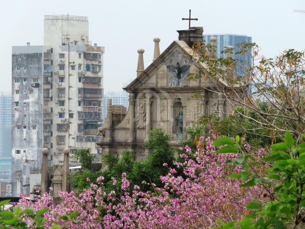 春天時候的牌坊,花朵盛開,更顯古蹟之美。而這個景色,也被製成明信片寄往各地(https://www.postcrossing.com/postcards/MO-72110 )。