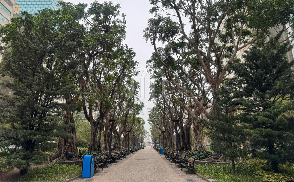 相片中兩旁的大樹像人體的兩個肺,代表著城巿的綠化和呼吸。遠處可見觀音像,衪在遠處默默地守護著澳門的生態環境。