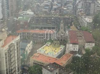 在一個陰雨天,從新葡京酒店高處眺望澳門舊城區,圖中可見到中華廣場、大三巴、澳門大炮台,以及再遠處的青洲一帶。