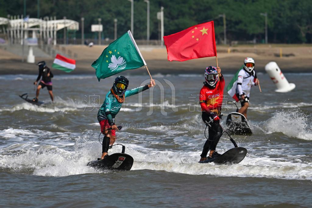 澳門格蘭披治動力衝浪板世界錦標賽總決賽於黑沙海灘舉行,賽事結束後選手們特意展示國旗及區旗,展示愛國愛澳情懷。