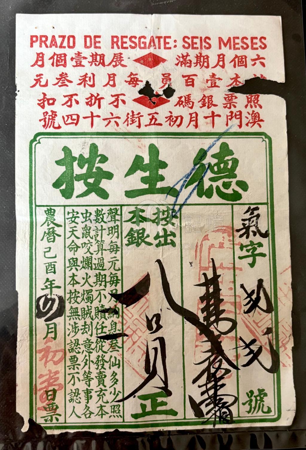 德生按是清末至民國時期澳門最具代表性的典當行之一,服務華人社區,是近代澳門金融史的重要見證。當票的頂部附有葡文與中文說明,葡文:PRAZO DE RESGATE: SEIS MESES 意思是「贖回期限:六個月」,是澳門作為葡屬殖民地的雙語標識,符合當地商業慣例。