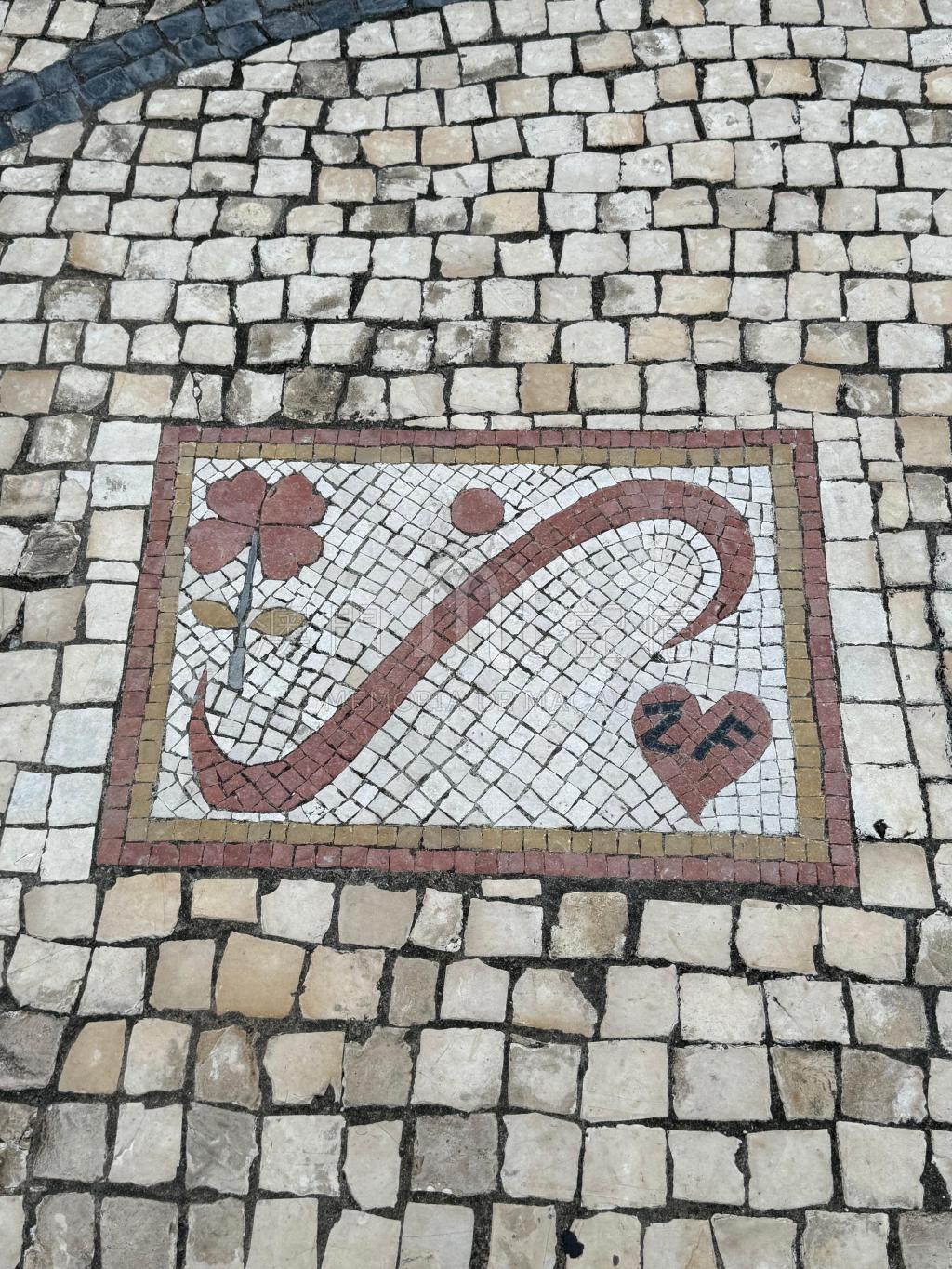 些碎石圖案位於連接觀音蓮花苑的長堤上,估計此碎石圖案與設計者的理念及名字有關。 觀音蓮花苑由葡萄牙建築師及雕塑家李潔蓮設計,於1999/3/21開幕,屬中葡友好紀念物10件中的最後1件。