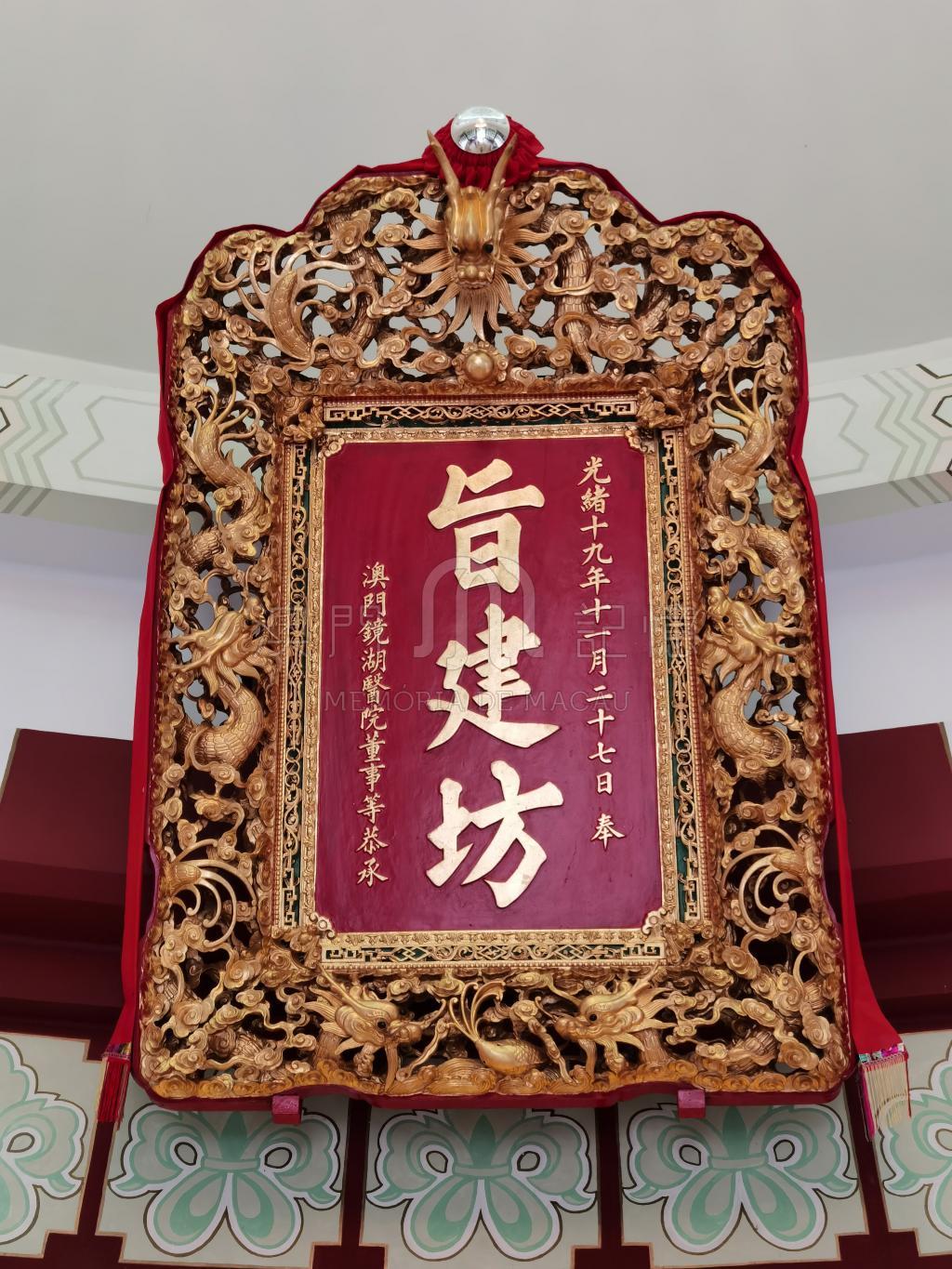 旨建坊匾額是澳門鏡湖醫院何穗田等紳董對內地捐款賑災有功,光緒皇帝下聖旨,令澳門建坊予以表彰,現懸挂在紀念館內的匾額是當年的實物,鏡湖醫院於1989年興建紀念館時對其進行了翻新 。該匾額見證了鏡湖醫院在慈善公益方面的傑出貢獻,具有極高的歷史價值和文物價值。
