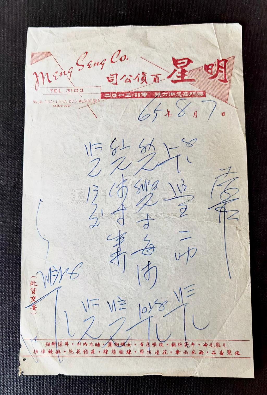 60年代澳門正處於經濟轉型期,百貨公司是當時市民消費的核心場所,這張單據反映了當時澳門零售業態與商品流通的實況。使用中文、英文與粵語方言詞彙,是澳門近代商業文書的典型樣貌,體現中西文化交融的城市特質。銀碼是用「蘇州碼字」,又稱花碼、草碼、商碼、柴碼等,是中國民間流行的數字,源於蘇州,由算籌演變而來,在港澳地區流行。