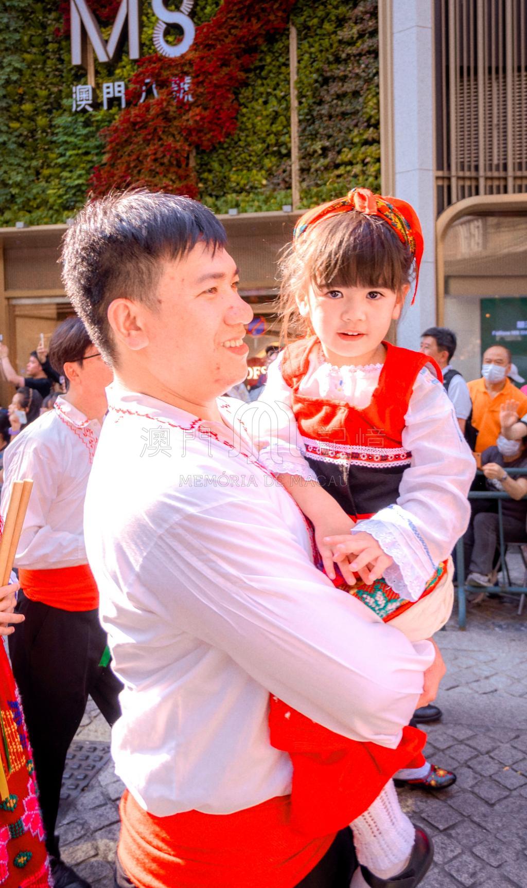 2025澳門國際幻彩大巡遊,小小葡萄牙土風舞舞蹈家,與她的父親一起向路人展示鮮艷的傳統服飾。