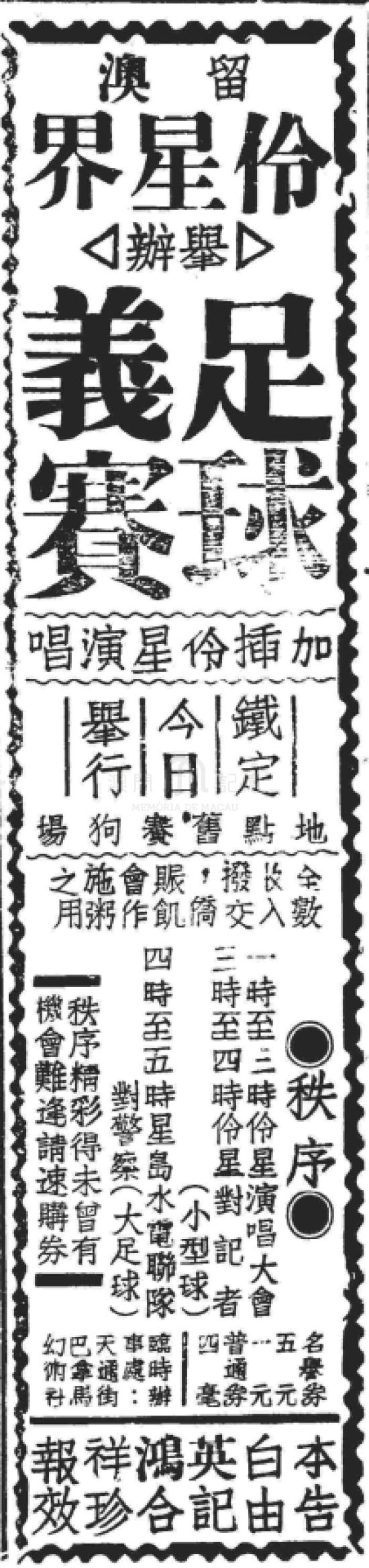 【1】《足球義演後日舉行,昨開始預銷名譽券》,《華僑報》1942年3月20日,第3版。
