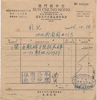 光绪三十三年(1907年2月13日─1908年2月1日)10月26日,《澳门政府宪报》公布全澳公私电话号码,大西洋澳门工程公所1907年公署及私家所用电话号数,全澳公私电话共有76架︰ 大炮台 1号 沙梨头兵卡 10号 工务司住家 20号 东望洋炮台 2号 竹仔室兵卡 11号 辅政司住家 21号 妈阁炮台 3号 福隆新街兵卡 12号 律政司住家 22号 望厦炮台 4号 花王庙兵卡 13号 国课官住家 23号 嘉思栏兵房 5号 关闸兵卡 15号 华政厅住家 24号 二龙喉兵房 6号 督署公事房 16号 岗顶玻楼 25号 船政厅 7号 监房 17号 督署 26号 马兵营 8号 公局医生房 18号 西望月 27号 连胜马路兵卡 9号 山顶武医院 19号 邮政署 28号 国课署 29号 仁慈堂 45号 卢光裕住家 61号 辅政司公事房 30号 公栈 46号 宝行银号 62号 国课官公事房 31号 斐难奴.罗记土住家 47号 宝裕银店 63号 按察司公事房 32号 良士.非厘喇住家 48号 时和摊馆 64号 西洋银行 33号 宋次生住家 49号 五和摊馆 65号 船政厅公事房 34号 亚渣度住家 50号 时行摊馆 66号 督理工程公所官署 35号 马蛟石防疫医院 51号 义得摊馆 67号 工程公所 36号 督理武备官住家 52号 源源摊馆 68号 议事公局 37号 华政署 53号 同源摊馆 69号 嘉罗斯船厂 38号 皇家大医生住家 54号 惠来摊馆 70号 皇家大书馆 39号 西政厅住家 55号 五章摊馆 71号 承充鸦片烟人住家 40号 按察司住家 56号 信行摊馆 72号 主教住家 41号 西政署 57号 五行摊馆 73号 三巴仔书馆 42号 嘉思栏玻楼 58号 荣生摊馆 74号 镜湖酒店 43号 萧登住家 59号 源利摊馆 75号 白马行医人庙 44号 五昌摊馆 60号 义行摊馆 76号 《澳门政府宪报》1907年10月26日第43号。 葡文作Club de Macau,即澳门俱乐部,在伯多禄五世剧院。 葡文作Observátorio Meteorológico,即气象台。。 葡文作Fábríca de Ópio,意为鸦片厂。 葡文作Fernando Rodrigues. 葡文作Leôncio Alfredo Ferreira,即飞良绍。 葡文作Carlos Augusto Rocha de Assumpção. 葡文作Fermino Machado,此人为20世纪初期澳门著名鸦片承充商。 葡文作Grémio de Macau,意为澳门同业公会,设在嘉思栏玻楼,即陆军俱乐部。