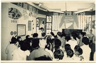 1961年10月29日,為慶祝鏡湖醫院成立九十周年而舉行為期一連八天的展覽會,工作人員向觀眾講解展品內容。
