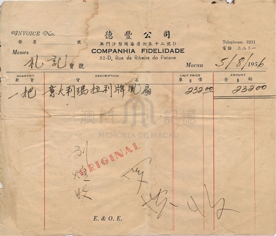 1956年,禮記雪糕向德豐公司購買意大利瑪拉利牌風扇一把,支付232元。圖為禮記雪糕的購貨單據,立於1956年8月5日。