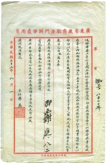 民國三十三年(1944年)八月一日,廣東省政府駐澳門辦事處主任羅鼐致函鏡湖醫院,奉廣東省政府核準頒發撥送慈善文化費一萬元,請派員具領。