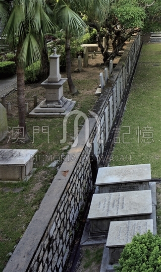 在白鴿巢東方基金會會址的一側,綠樹掩映的矮牆之中,旁開着一道小門,仔細查看其說明牌,上面書寫着“澳門基督教聖堂及墓地”,此處就是基督教墳場所在地。