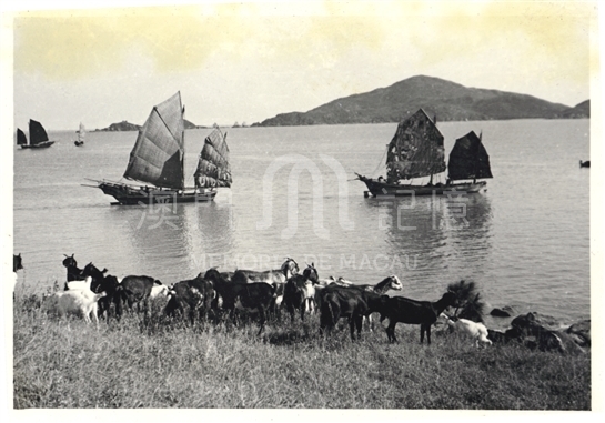 運輸船(前)和捕乃魚艇(後)正在路環海岸捕魚,岸上山羊為印度人飼養,悠然自得。