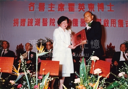 霍英東博士捐贈鏡湖醫院醫療儀器設備啟用儀式於1990年9月29日舉行,霍英東博士贈送鏡湖醫院儀器名稱紀念冊,梁秀珍院長代表接受。