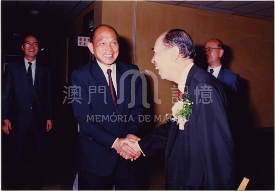 霍英东博士捐赠镜湖医院医疗仪器设备启用仪式于1990年9月29日举行,马万祺主席(右)欢迎霍英东博士。