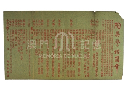 1929年陶英學校招生簡章。在其學校簡介中表明“尤重國文一科”,其內容包括古文、信札、作文、孟子、書法、詩詞等,可見其對國學的重視。另陶英亦開辦夜校。