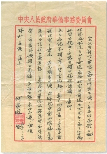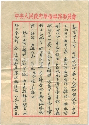 1950年1月22日,中央人民政府华侨事务委员会何香凝女士致函澳门华侨协会负责人郭信坚先生。为了医治好战争给我们国家带来的各种创伤。以便开始进行建设工作,中央人民政府发行胜利折实公债,藉以弥补部份财政上的赤字, 减少国家的困难。希望澳门华侨协会本着爱护祖国之素志,率先购买公债,同时号召当地侨胞,展开广泛的推销公债运动。以便获得预期的成绩。