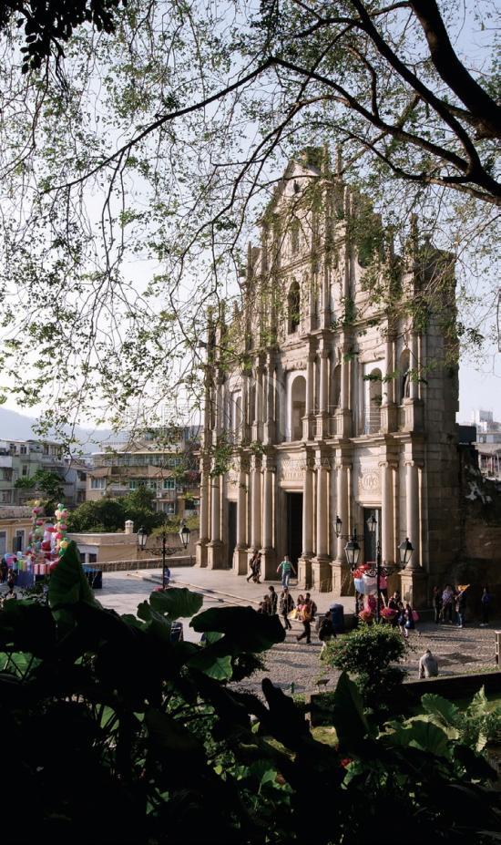 巍峨瑰丽,雄冠远东教区之圣保禄教堂和修院,自一八三五年被毁后,耶稣会士既早遭逮捕,故教堂之重建,实再无人代谋矣。留下断垣残瓦,沦作废墟。遂由议事公局于同年四月八日,委派主教之代办人佛郎高神甫(Candido Goncalves Franco)将其辟作坟场,盖其坭墙甚厚,可以挖空内壁,埋棺墙中,一如古代罗马之宗教葬礼。迨至一八三六年五月十四日议事公局再将之交与仁慈堂管理。令凡来葬者,均须纳费以充善款,并指定以五千元另辟贫者墓地。此种办法虽已获得仁慈堂同意,但当时之亚马勒兵头(Ferreira do Amaral),竟于一八三七年二月九日颁一谕令,着该坟场应按照教会规律,交回教会管理,定于六月一日开始执行。又在一八三八年令将各危墙一律拆矮──至二十五尺高,以保安全。一八四三年海外殖民局曾寻得一记载,兹录述如下: “大三巴遗址利用作坟场办法,将各危墙改矮至一半,各废柱平衡排置,另用砖砌成一小道于其上,直贯全场。教士古墓则开穴墙中,各普通坟则平葬道旁,入路两傍之拱窿则放置骨石。于教堂旧址另筑一小祭坛,以为葬礼前之祭祀处。场内遍植柏树。凡来葬者均须缴税,拨充仁慈堂善款。场外邻近,预留将来扩充余地。石门牌坊则保存无损,俾资后人瞻仰。此种任务,从一八三七年起,交由圣约瑟修院(College of St. Joseph)之上司负责。”云云。自圣保禄教堂和修院遭焚后,当局迺将其残址改作坟场。原来教堂背后之钟楼上,本有大钟两面,迺澳门旧日出名之波加劳造炮厂(Tavares Bocarro's Foundry)所铸者,亦被迁移安置于牌坊之第二层左右两窗框内,作为葬礼鸣报丧钟之用。嗣是该坟场一向被沿用,作为教徒及西人之墓地,直至一八五四年十一月二日才停止安葬。至一八七八年鸦高士子爵(Viscount Pa ç o d’Arcos)来任澳门兵头时,迺下令将前时所葬下各墓,一律迁葬于西洋坟(St. Miguel)内。所有断壁危墙,悉数夷为平地。至是两个古钟,亦失其所在。所遗之教堂残碣及墓碑,或移作邻近房屋建筑墙脚,或用船载往吕宋之马尼刺(Manila),敷砌古城街边。后来更将牌坊背后之废地,辟成花圃草坪,门口加建铁闸,用以点缀和保护此名胜古迹。迨至近年各处旅客来游日众,澳门工务局遂将该牌坊右侧修院废址(此地曾为贫民巢窟,尝遭火灾多次,后来当局迺将贫民移居台山,尚遗留破屋多间)之破屋拆去,新辟一斜坡马路,以利汽车来往,从此游客称便矣。大三巴牌坊,即为澳门名胜古迹之一,亦为澳门唯一之突出标志。历尽数百烽火风暴,犹安然独存。曾经吸引多少古今名人,几许中西游客,为之兴怀,为之歌咏。在中国诗词方面,前章已略举例。至于西文诗歌,最能哙炙人口者,当推一八五五年香港总督包令约翰 (Sir John Bowring)所写之“荣哉宝架”:(In the Cross of Christ Glory!)—歌,其曲谱又为英国音名家康奇(Ithamar Conkey)所作,称为世界名曲之一,惜其歌词太偏重宗教。三巴古坊,百年残阙,已荒废久矣。岂料当二十世纪初期,还有人想设法重建之者,盖在一九○二年时,澳门公教会中,有一位长老名约瑟黔枚神甫(Rev. Dr. Antonio Jose Gomes),痛惜梵宇类荒,自愿竭力护法,迺不辞劳苦,百方筹募,终捐得白银一万六千九百多元。在六十年前,澳门工资物价皆极低廉。募得此项巨款,实较重建预算所差无几。于是着手策划,绘备图则,务求尽可能依据原日之圣保禄教堂模样,照样筑回一所。讵知其年高任重,积劳成疾,以致宿愿未偿,身已先死,自后继志乏人。且闻捐得之款,曾由其经手存于银行,现在没人合法提取,致使重建圣保禄教堂之议,终成泡影也。至于圣保禄教堂之本来面目究竟如何?应如何照样重建?此迺必须解决之问题。据闻当教堂尚未被焚前,曾有一位英国著名画家佐治千拿厘(George Chinnery)居留在澳门,后来其遗作多珍藏于英伦及罗马等博物院,或对教堂所绘,有足资参攷者。且在一七二六年还有一荷兰雕刻,曾显示该教堂迺在炮台下方,楼高二层,中有一尖塔,但不甚高云云。整座教堂形式,既可研究得之。但吾人如今面对现实,举头可见牌坊,堂皇宏伟,留心细看雕刻,精致玲珑,其建筑之壮丽,其艺术之奇巧,在在令人称羡,处处足供研究,故再不避愚陋,只就大三巴牌坊之门面所见,分为“艺术建筑之构成”,与“宗教雕刻之表现”。