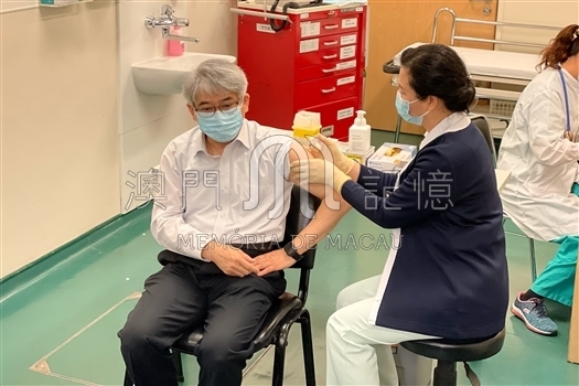 隨着首批 10 萬劑國藥新型冠狀病毒滅活疫苗抵澳,特區政府有序開展疫苗接種工作,應變協調中心2月9日在仁伯爵綜合醫院舉行新型冠狀病毒疫苗接種啟動儀式,行政長官賀一誠率領經濟財政司司長李偉農、保安司司長黃少澤、社會文化司司長歐陽瑜、運輸工務司司長羅立文、檢察長葉迅生、廉政專員陳子勁、警察總局局長梁文昌、海關關長黃文忠、各司長辦公室主任、衛生局領導層及屬優先接種的醫護、警務、消防、海關、航空及貨運、社服、教育、博彩業的前線人員代表等 80 多人接種疫苗。