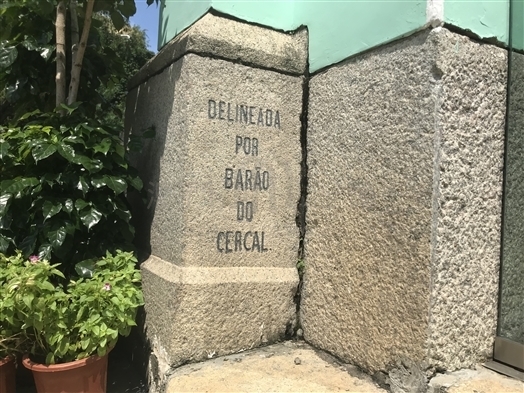 聖彌額爾小堂正門左石柱用葡萄牙文刻上由塞爾卡爾男爵設計的文字。