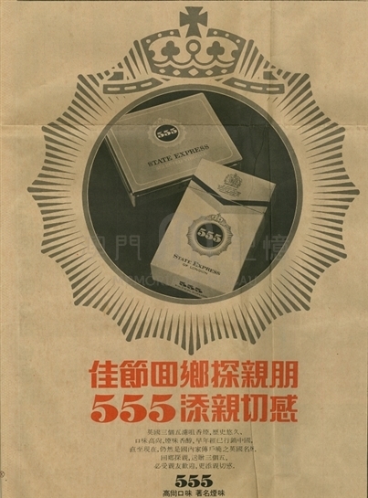 555(港澳又稱三個五)是英美煙草旗下的一個百年經典香煙品牌。圖為刊登在1980年5月13日《澳門日報》的555香煙廣告,廣告標題為"佳節回鄉探親朋,555添親切感"。