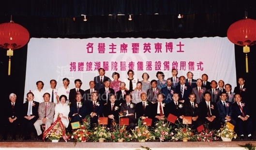 霍英東博士捐贈鏡湖醫院醫療儀器設備啟用儀式於1990年9月29日舉行,霍英東博士與鏡湖醫院慈善會董事暨貴賓合照留影。