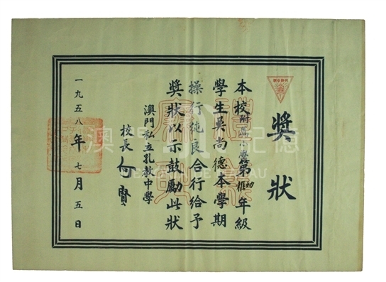 此为1958年私立孔教中学附属小学幼稚园学生操行优良奖状。从下款可见其时校长为何贤先生。