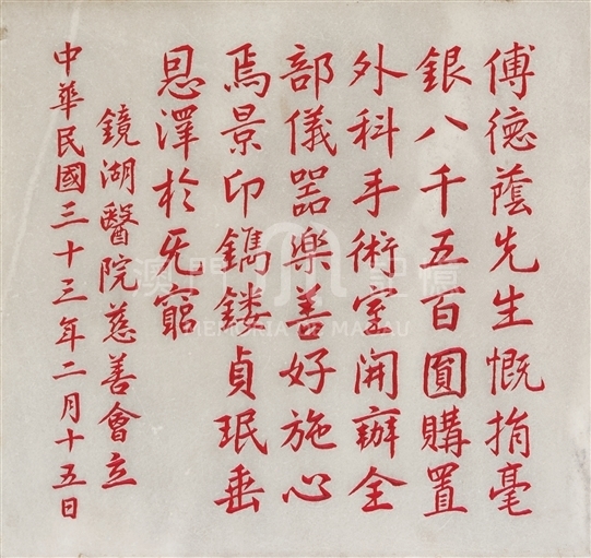 民國三十三年(1944年),傅德蔭先生捐毫銀八千五百元,購置鏡湖醫院外科手術室開辦全部儀器。