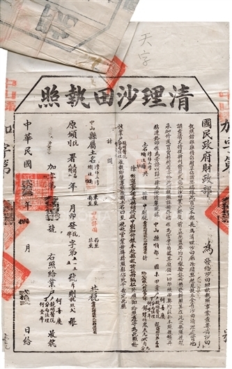 民国二十三年(1934年)八月二十二日,国民政府财政部发出清理沙田执照,编号第叁仟捌佰柒拾号。(土名湾仔三湾烂湴塘)