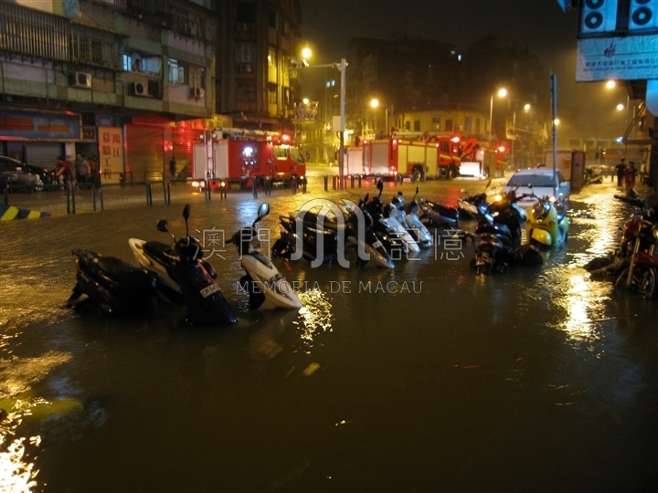 2008年9月23日颱風“黑格比”下,沙梨頭一帶水浸,消防車救援。