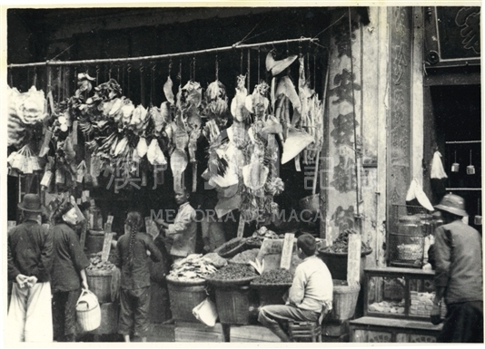 Mariscos secos pendurados nas entradas das lojas.