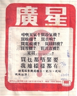 廣告文案:咁嘅天氣!買冷氣機?買暖爐?買音響?買電視機?買BB機?(按:傳呼機)買雪櫃?買洗衣機?定買……?買乜都唔緊要,我地樣樣都有請駕臨參觀選購啦,記住,我哋嘅地址係:澳門台山嘉翠麗大廈C座101至102地下電話:5545 85545