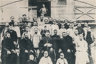 一九零六年四月二日,澳門鮑主教與第一批慈幼會來華會士,合照於澳門母校。