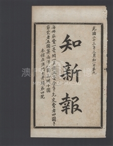 《知新報》第九期刊登《地球六大罪案考總序》、《論暹王出游》、《鐵路說帖》、《光學植物》等文章。《知新報》於1897年2月22日(清光緒二十三年正月二十一日)創刊,由康有為籌劃出版、梁啟超兼理筆政、何廷光(字穗田)出資、康廣仁則負責具體運作創辦,該報於維新運動時期所創辦,為維新派在華南地區的重要刊物。1898年(清光緒二十四年)的百日維新失敗後,《知新報》仍繼續出版。1899年7月20日,康有為在加拿大創立保救大清皇帝會後,更將《知新報》與《清議報》定為會報。《知新報》原按上海《時務報》模式創辦,初擬為《廣時務報》。及後經梁啟超斟酌後,才定名《知新報》,報頭使用篆書。其辦報宗旨,正如其創刊文章的「知新報緣起」指出:「不慧於目,不聰於耳,不敏於口,曰盲、聾、啞,是謂三病」而「報者,天下之樞鈴,萬民之喉舌也,得之則通,通之則明,明之則勇,勇之則強,強則政舉而國立,敬修而民智。」《知新報》是澳門第二份中文報紙,翻譯不少西文報刊,錄英、俄、德、法、美、日等各國大事,同時遠銷海外舊金山、悉尼、安南、新加坡等地。設社址於澳門南灣大井頭四號,其後在1900年11月22日(清光緒二十六年十月初一)出版的第129期有遷館告白:從大井頭四號移寓至門牌十九號。初為5日刊,自1897年5月31日(清光緒二十三年五月初一)的出版的第20冊起,改為旬刊 (十日刊),篇幅較前增加一倍;又至1900年2月14日(清光緒二十六年正月十五日)出版的第112冊開始,再改為半月刊,每期約60餘頁,冊裝。目前所收集的最後一期是1901年2月3日(清光緒二十六年十二月十五日)出版的第134冊,是否仍有後續出版的刊冊,有待進一步研究。本會感謝中山大學圖書館的支持,合作將該館珍藏的共134冊《知新報》原件進行電子化,得以在此平台與公眾分享。此外,本會為每期之目錄加設鏈結功能,以便各方讀者閱讀。《知新報》主要撰述和譯者如下:撰述:何樹齡、韓文舉、梁啟超、徐勤、劉楨麟、王覺任、陳繼儼、歐榘甲、康廣仁、黎祖健、麥孟華、林旭、孔昭炎、康有為 英譯:周靈生、盧其昌、陳焯如、甘若雲葡譯:宋次生德譯:沙士日譯:唐振超、山本正義、康同薇