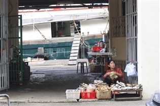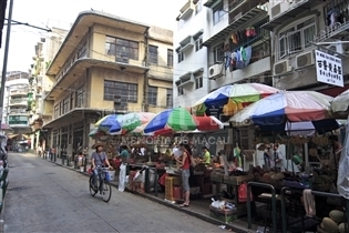 下環街市附近,圖中的黃色建築是已被拆卸的均益炮竹廠。均益炮竹廠於2013年宣佈清拆,當時引起不少公眾和媒體的關注。