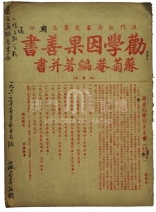 此為1962年出版之《勸學因果善書》,編者蘇菊菴為菊菴國文專科學校校長,書中多為學校記事,亦有不少勸學篇章。